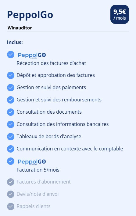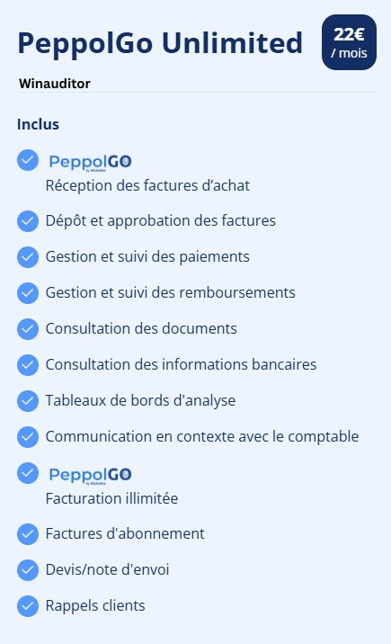 - Pour la récéption via peppol et l'envoie des factures ventes (via winauditor): 22 euros/mois avec accès à la comptabilité.